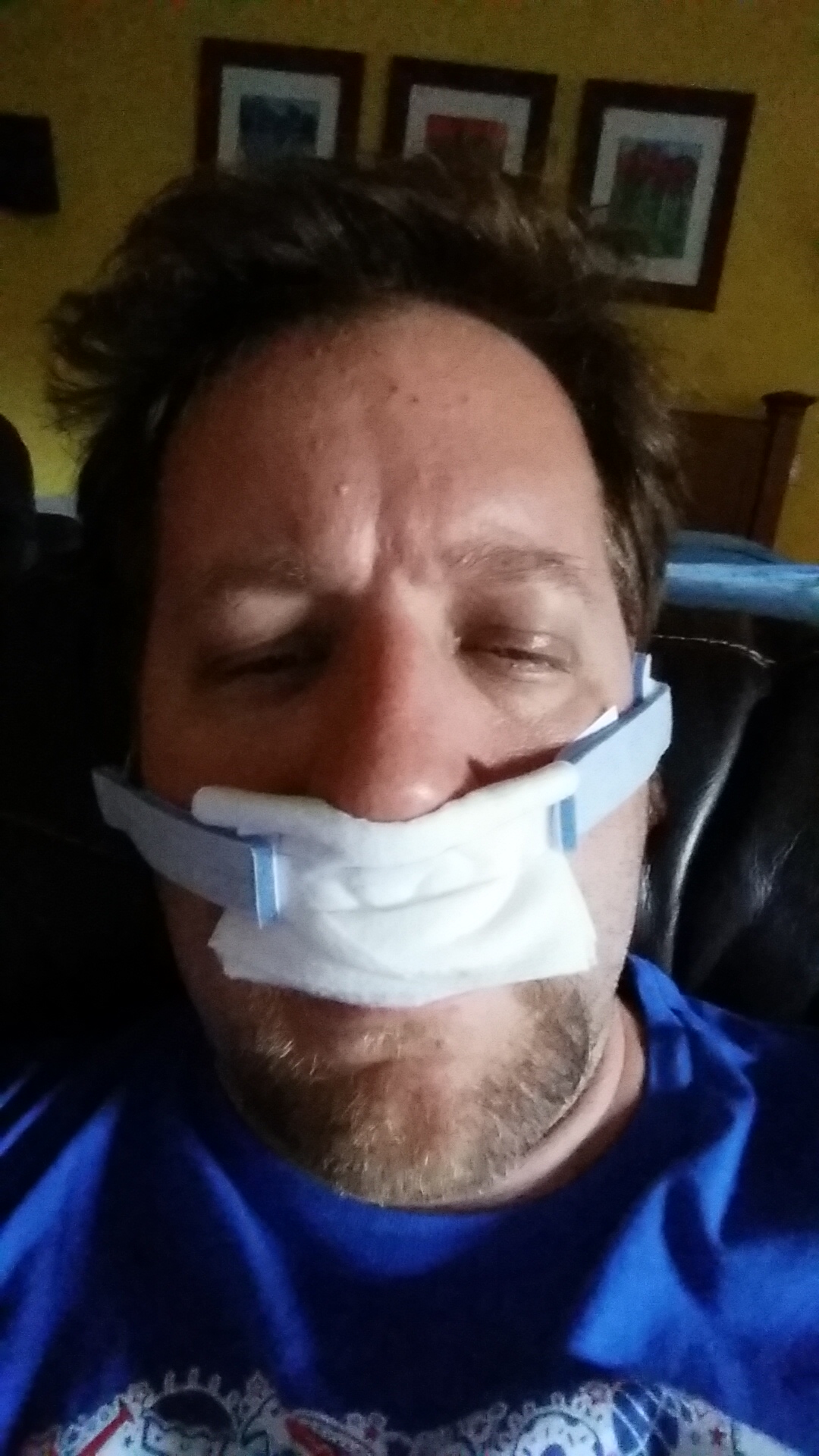 Going home, I’ve got an ear-sling/nose stopper to wear due to the fact that my nose is pouring goo and blood. (I’m not really as annoyed as I look in the picture.)
