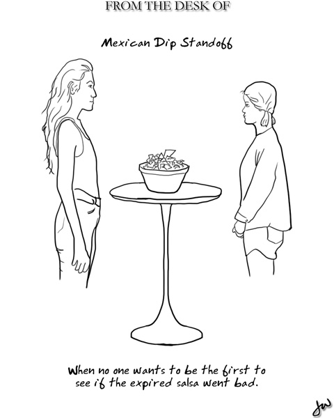 two women standing on either side of a bowl of salsa, looking at each other but not eating