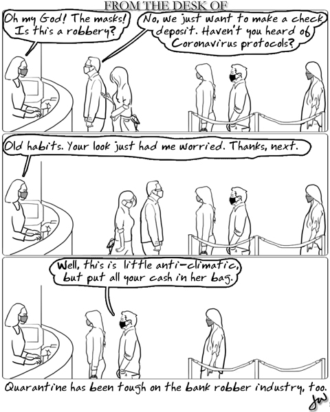 People in line at a bank, teller is unable to determine robbers from clients because everyone wears a mask.