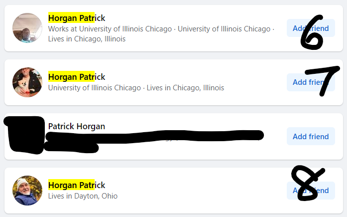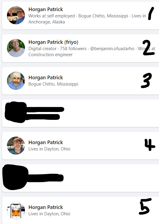 So I did a search on the original name “Horgan Patrick” in Facebook and I found eight people with this unusual name. Somehow the Jesus HP profile (above) did not come up in a search. Here are the first five (two matches with authentic people have been blacked out).