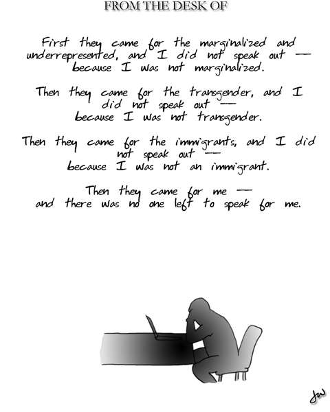 This is based on a well-known quote by the Rev. Martin Niemöller (1892-1984). It is often brought out when people talk about scapegoating minorities and other populist tactics — dividing “us” against “them.” After the war, Niemöller realized that accepting small sins as the new status quo was enabling those that sought to divide us.