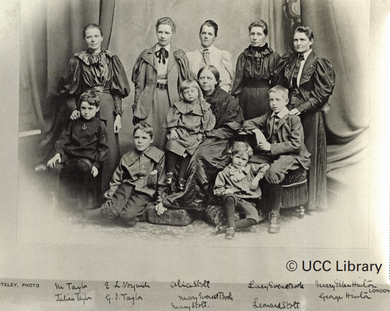 The Boole women and their kids. Back row: Margaret Taylor, Ethel L Voynich, Alicia Boole Stott, Lucy E Boole, Mary E Hinton Seated: Julian Taylor, Mary Stott, Mary Everest Boole, George Hinton In front: Geoffrey Ingham Taylor, Leonard Stott